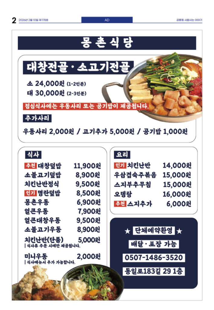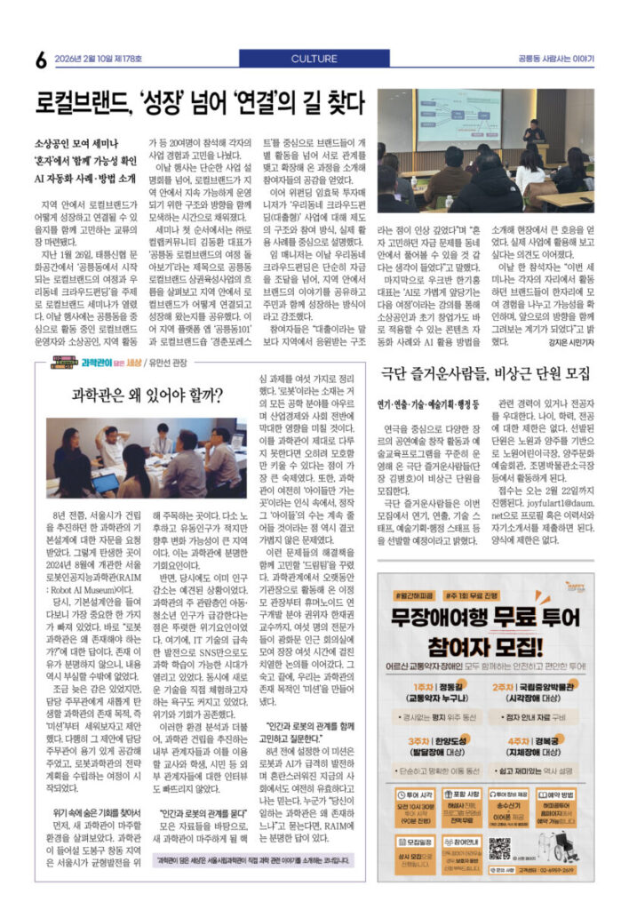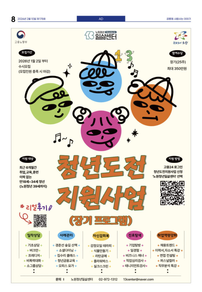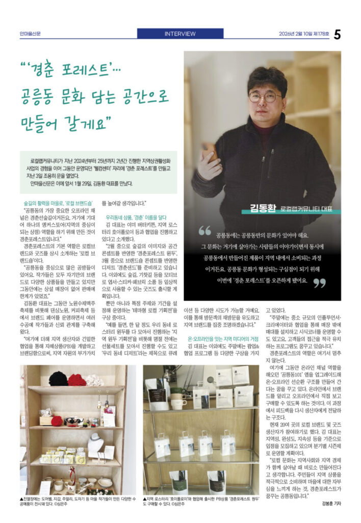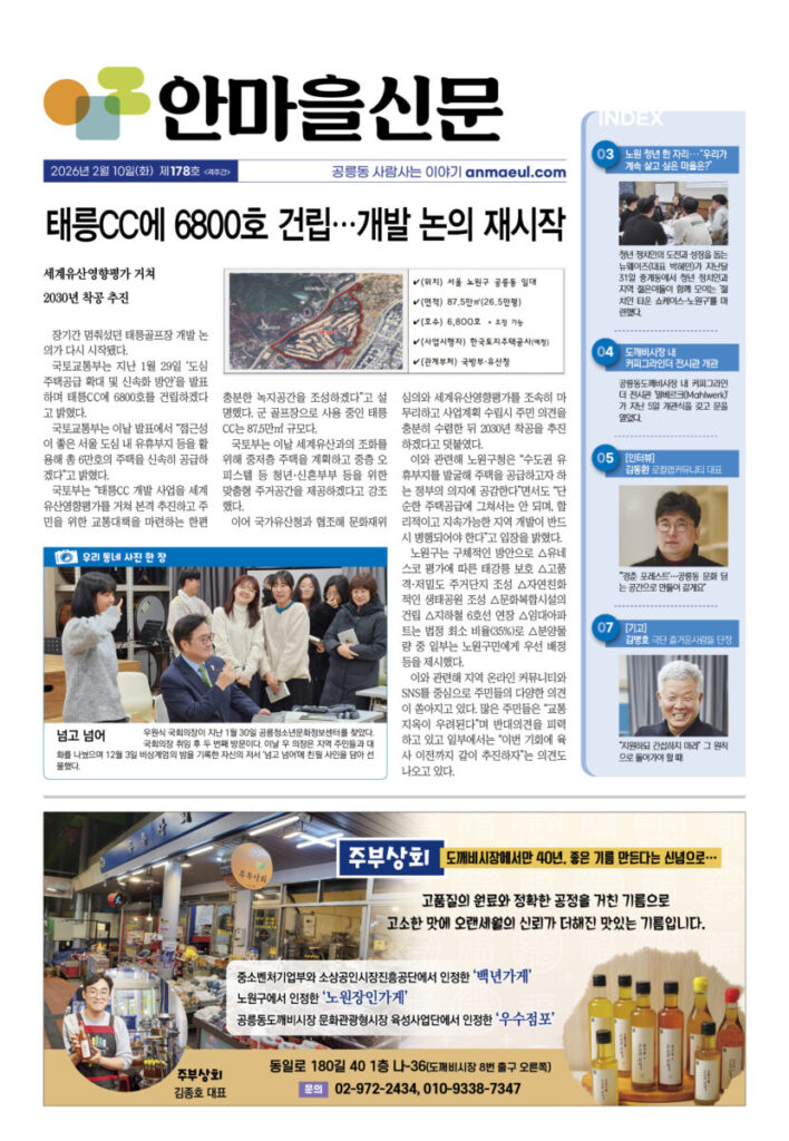 안마을신문 178호 지면신문2026년 02월 10일1면 태릉CC에 6800호 건립···개발 논의 재시작3면 노원 청년 한 자리···“우리가 계속 살고 싶은 마을은?”4면 도깨비시장 내 커피그라인더 전시관 개관5면 인터뷰-김동환 로컬랩커뮤니티 대표“‘경춘 포레스트’···공릉동 문화 담는 공간으로 만들어 갈게요”6면 로컬브랜드, ‘성장’ 넘어 ‘연결’의 길 찾다7면 기고—김병호 단장 극단 즐거운사람들“지원하되 간섭하지 마라” 그 원칙으로 돌아가야 할 때광고 카카오톡 밴드 링크 강봉훈 기자https://anmaeul.com 인기 기사태릉CC에 6800호 건립···개발 논의 재시작화랑대철도공원···로컬100에 다시 뽑혀행동하는 양심···나눔으로 실천노원 청년 한 자리···“우리가 계속 살고 싶은 마을은?”넘고 넘어해피버스 버거데이-어린이식당 북부장애인복지관“‘경춘 포레스트’···공릉동 문화 담는 공간으로 만들어 갈게요” 뉴 스노원 청년 한 자리···“우리가 계속 살고 싶은 마을은?”화랑대철도공원···로컬100에 다시 뽑혀행동하는 양심···나눔으로 실천로컬브랜드, ‘성장’ 넘어 ‘연결’의 길 찾다극단 즐거운사람들, 비상근 단원 모집맹추위에도 씽씽눈썰매장 6만6천여명 이용
