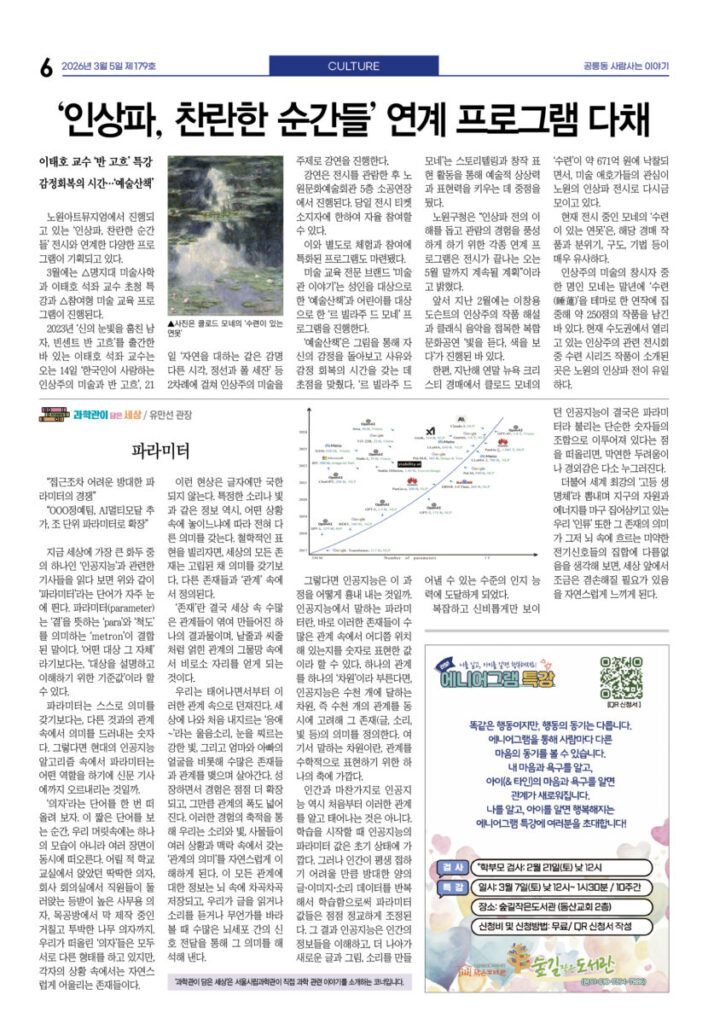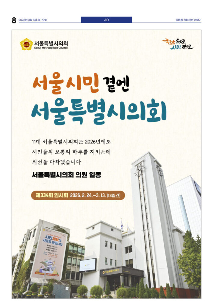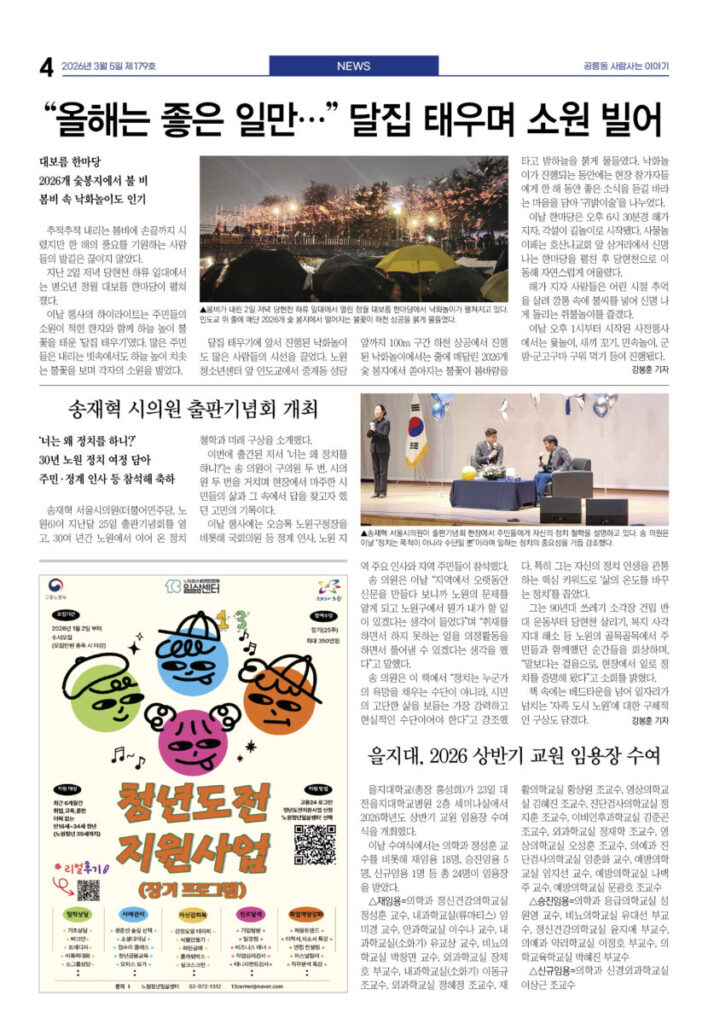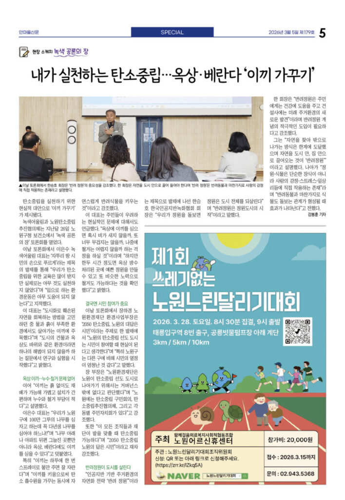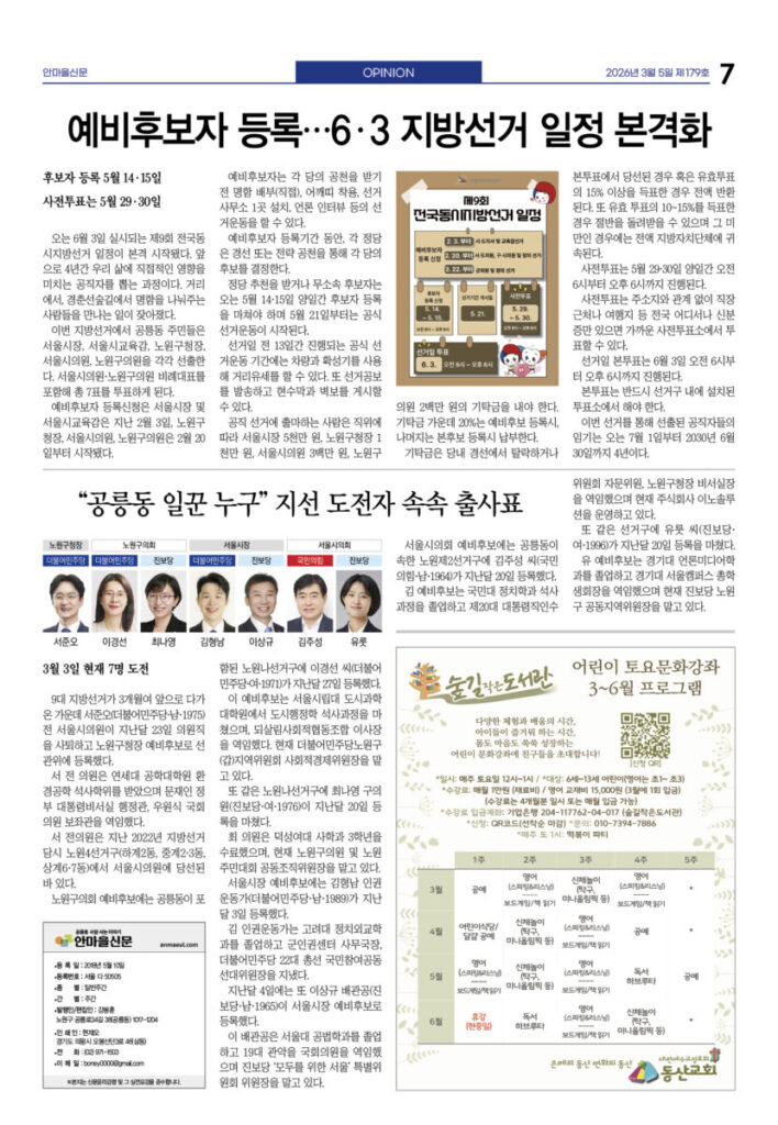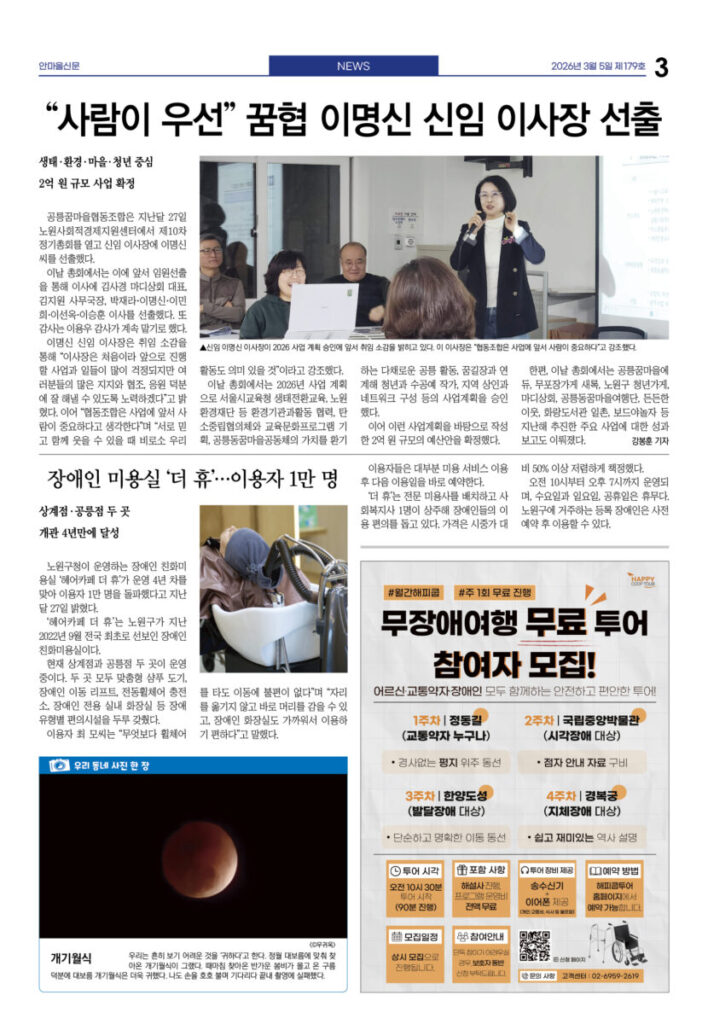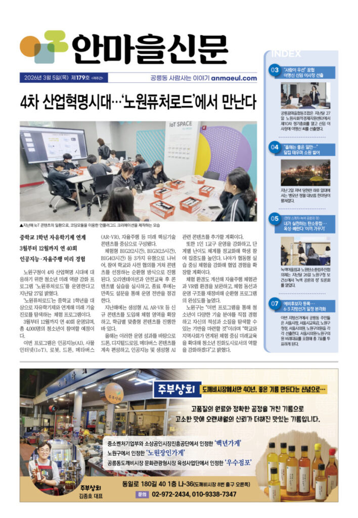 안마을신문 179호 지면신문2026년 03월 05일안마을신문 179호 지면신문1면 4차 산업혁명시대···‘노원퓨처로드’에서 만난다3면 “사람이 우선” 꿈협 이명신 신임 이사장 선출4면 “올해는 좋은 일만···” 달집 태우며 소원 빌어 송재혁 시의원 출판기념회 개최5면 현장 스케치 녹색공론의 장 내가 실천하는 탄소중립···옥상·베란다 ‘이끼 가꾸기’6면 ‘인상파, 찬란한 순간들’ 연계 프로그램 다채 <과학관이 담은 세상> 파라미터7면 예비후보자 등록···6·3 지방선거 일정 본격화 “공릉동 일꾼 누구” 지선 도전자 속속 출사표광고 카카오톡 밴드 링크 강봉훈 기자https://anmaeul.com 인기 기사“사람이 우선” 꿈협 신임 이명신 이사장 선출“공릉동 일꾼 누구” 지선 도전자 속속 출사표4차 산업혁명시대···‘노원퓨처로드’에서 만난다예비후보자 등록···6·3 지방선거 일정 본격화‘인상파, 찬란한 순간들’ 연계 프로그램 다채장애인 미용실 ‘더 휴’···이용자 1만 명“올해는 좋은 일만···” 달집 태우며 소원 빌어개기월식쓰레기 없는 노원느린달리기대회송재혁 시의원 출판기념회 개최 뉴 스“공릉동 일꾼 누구” 지선 도전자 속속 출사표“사람이 우선” 꿈협 신임 이명신 이사장 선출“올해는 좋은 일만···” 달집 태우며 소원 빌어장애인 미용실 ‘더 휴’···이용자 1만 명‘인상파, 찬란한 순간들’ 연계 프로그램 다채송재혁 시의원 출판기념회 개최