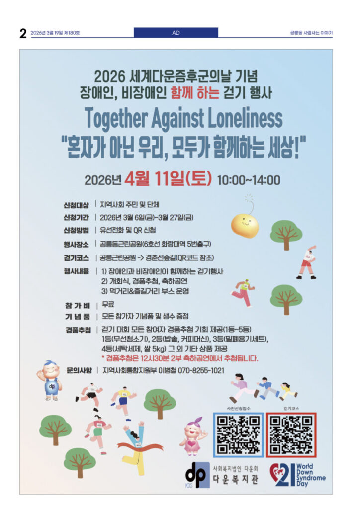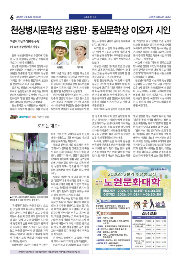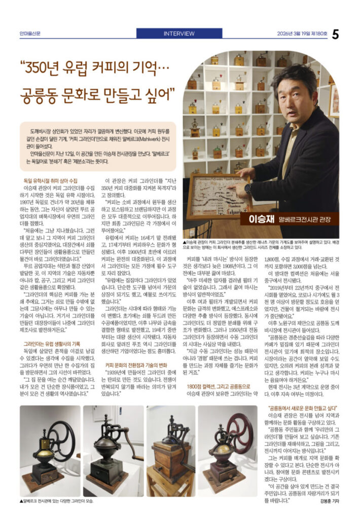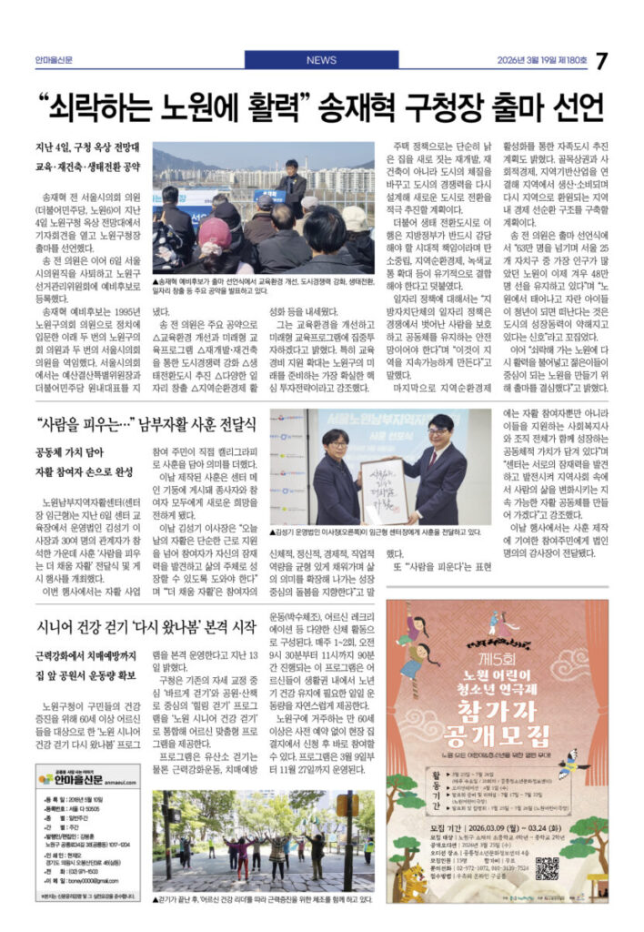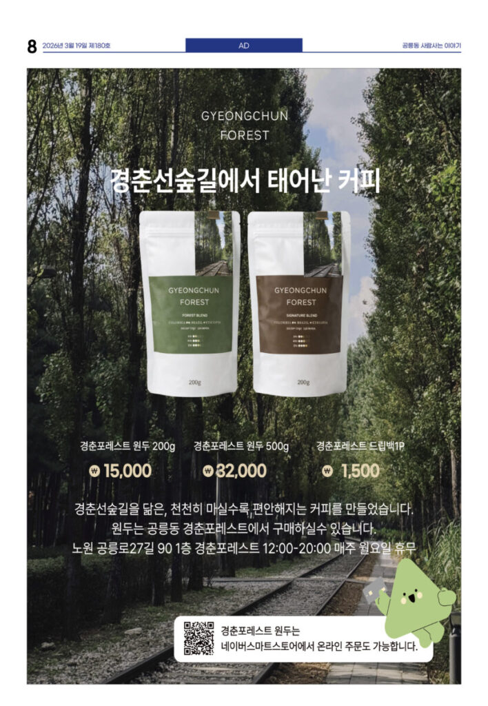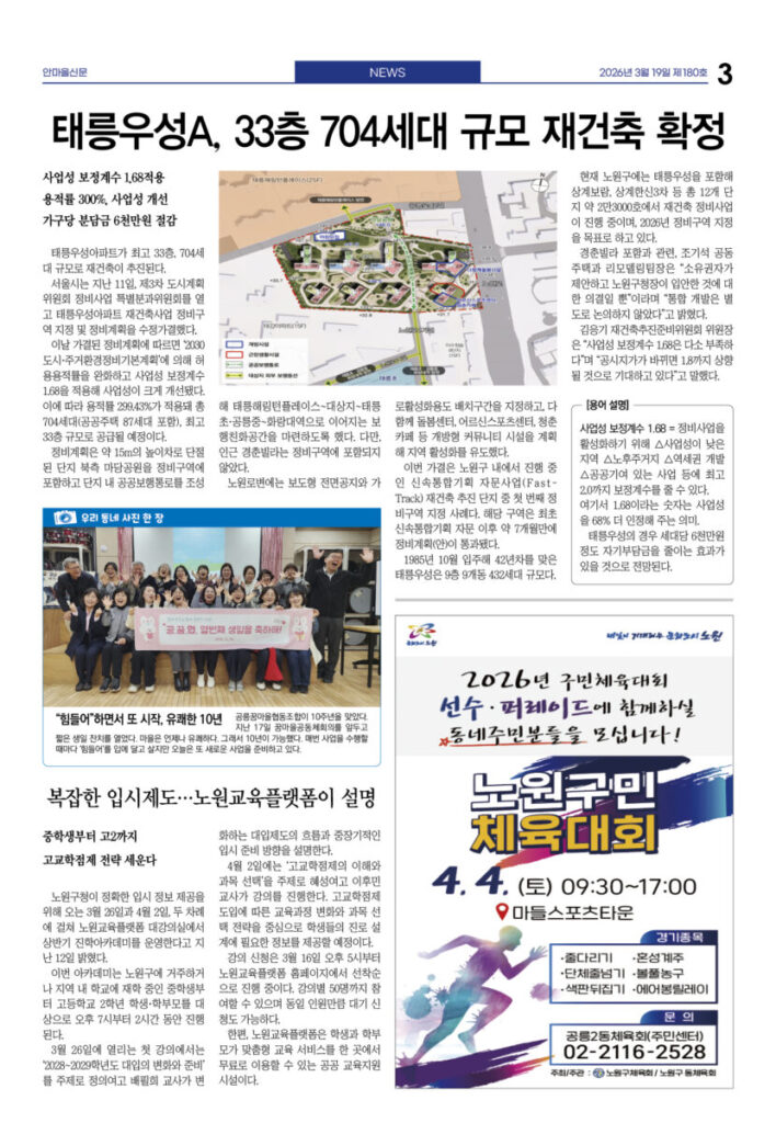안마을신문 180호 지면신문 2026년 03월 19일1면 공1 주민센터, 공릉역세권 랜드마크로 이전3면 태릉우성A, 33층 704세대 규모 재건축 확정4면 복지관·도서관으로···어린이식당 운동 확산5면 인터뷰—이승재 말베르크전시관 관장 “350년 유럽 커피의 기억···공릉동 문화로 만들고 싶어”6면 천상병시문학상 김용만·동심문학상 이오자 시인7면 “쇠락하는 노원에 활력” 송재혁 구청장 출마 선언광고 카카오톡 밴드 링크 강봉훈 기자https://anmaeul.com 인기 기사“빨리 보다 함께” 느린달리기대회 ‘출발’“힘들어”하면서 또 시작, 유쾌한 10년시니어 건강 걷기 ‘다시 왔나봄’ 본격 시작복지관·도서관으로···어린이식당 운동 확산노원 백두산 원정대 모집 – 해피쿱투어월계어르신휴센터 개관식천상병시문학상 김용만·동심문학상 이오자 시인“350년 유럽 커피의 기억···공릉동 문화로 만들고 싶어”태릉우성A, 33층 704세대 규모 재건축 확정노원문화대학 2분기 수강생 모집 뉴 스복지관·도서관으로···어린이식당 운동 확산시니어 건강 걷기 ‘다시 왔나봄’ 본격 시작“빨리 보다 함께” 느린달리기대회 ‘출발’복잡한 입시제도···노원교육플랫폼이 설명천상병시문학상 김용만·동심문학상 이오자 시인태릉우성A, 33층 704세대 규모 재건축 확정