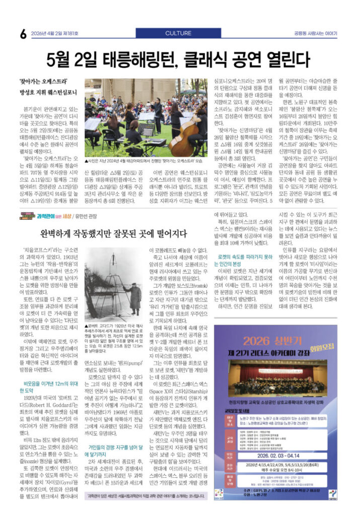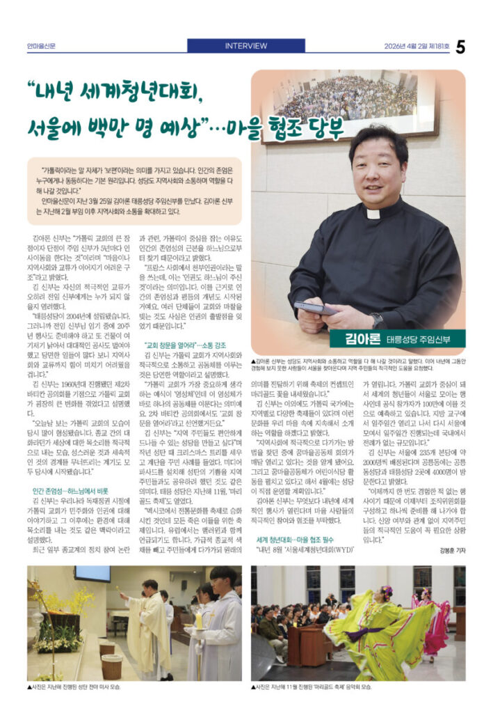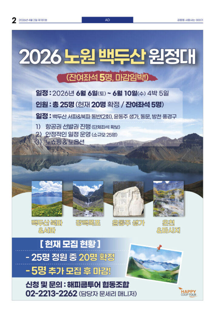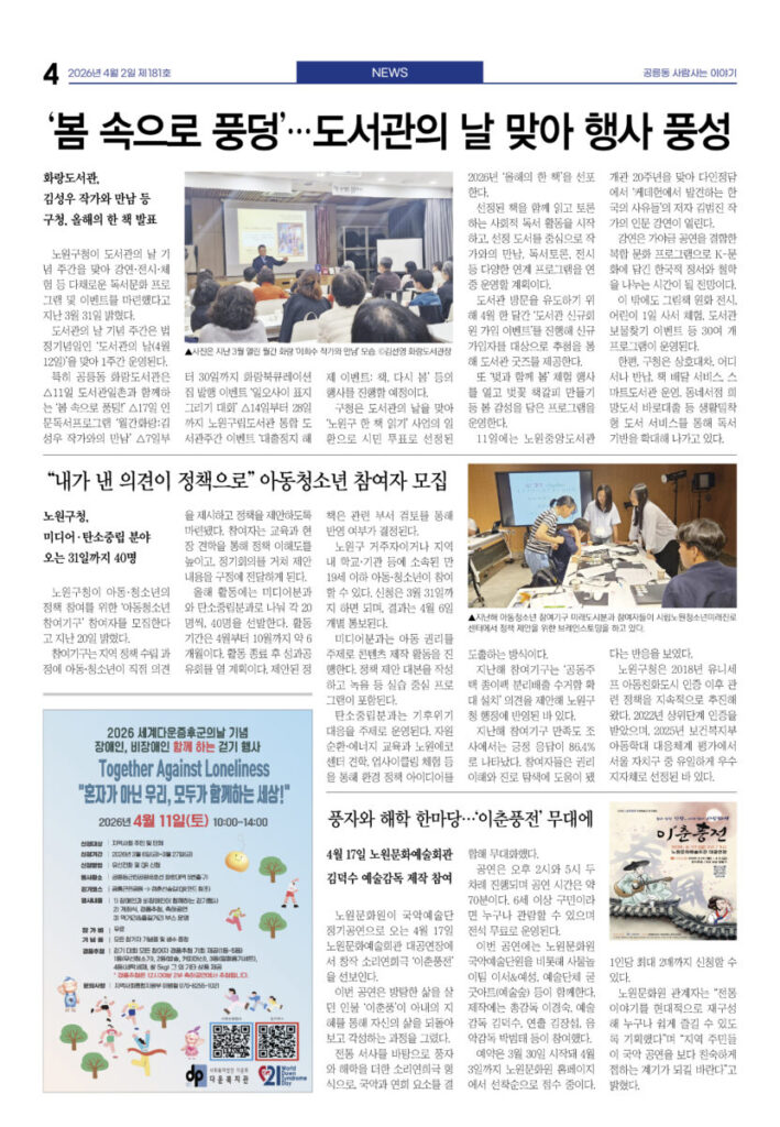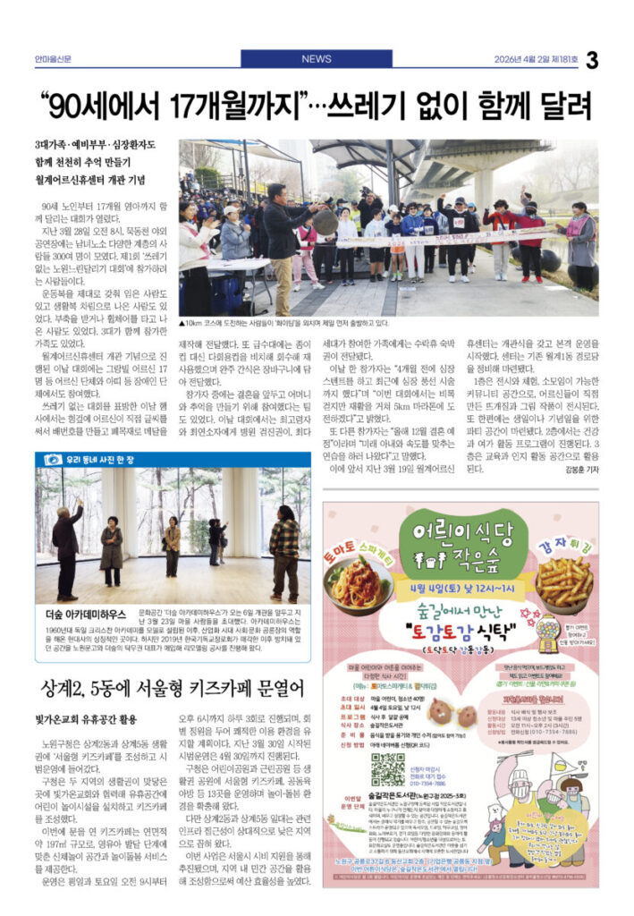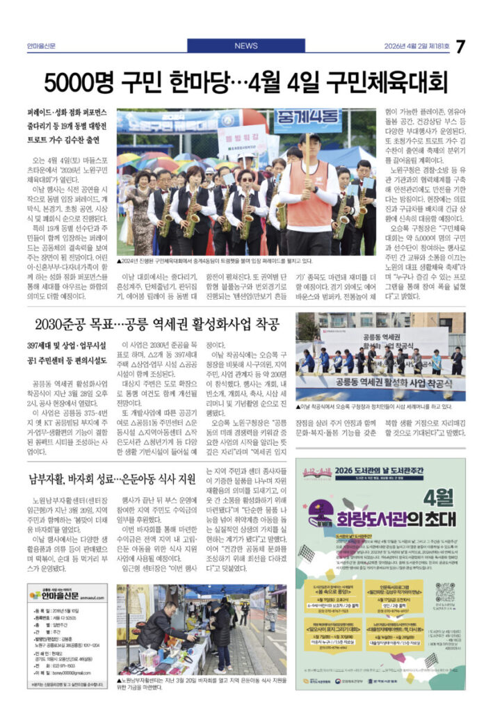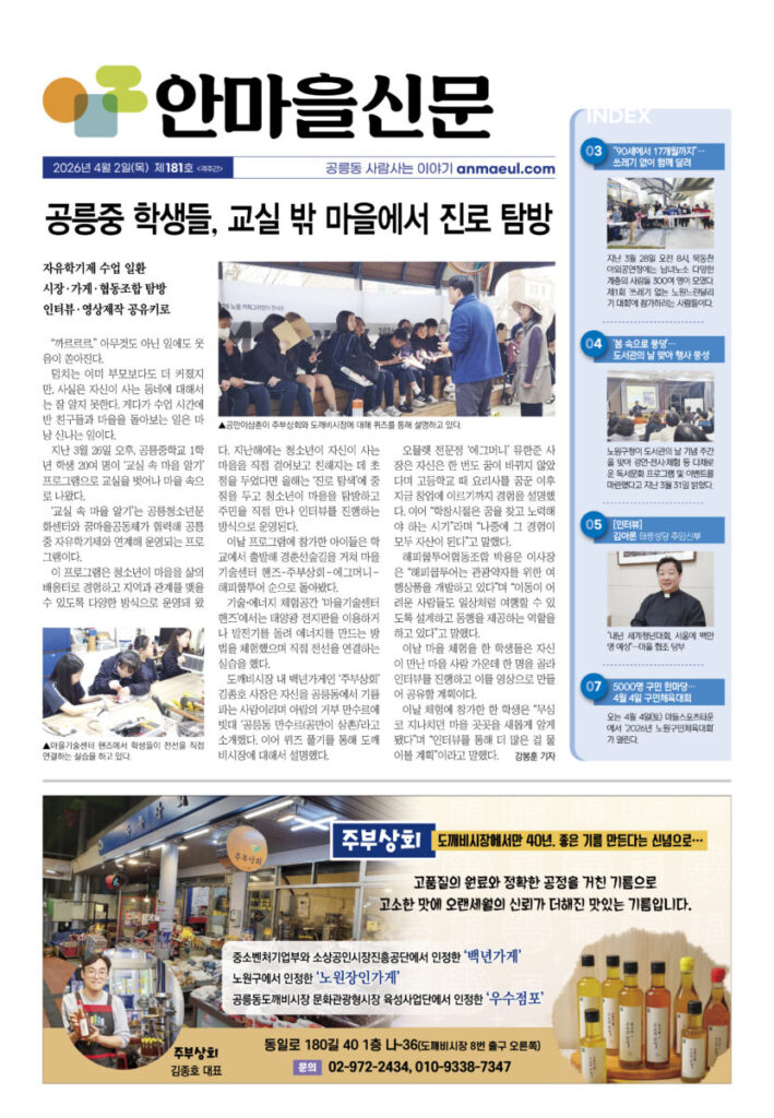 안마을신문 181호 지면신문2026년 04월 02일안마을신문 181호 지면신문1면 공릉중 학생들, 교실 밖 마을에서 진로 탐방3면 “90세에서 17개월까지”···쓰레기 없이 함께 달려4면 ‘봄 속으로 풍덩’···도서관의 날 맞아 행사 풍성5면 인터뷰—김아론 태릉성당 주임신부 “내년 세계청년대회, 서울에 백만 명 예상”···마을 협조 당부6면 5월2일 태릉해링턴, 클래식 공연 열린다7면 5000명 구민 한마당···4월4일 구민체육대회광고 카카오톡 밴드 링크 강봉훈 기자https://anmaeul.com 인기 기사2030준공 목표···공릉 역세권 활성화사업 착공화랑도서관 어린이 자원활동 동아리 모집상계2, 5동에 서울형 키즈카페 문열어2026 발명학생 선발 – 미래산업과학고어르신휴센터 첫 전시 – 월계어르신휴센터“90세에서 17개월까지”···쓰레기 없이 함께 달려어린이 환경지킴이 모집 – 노원환경재단공릉중 학생들, 교실 밖 마을에서 진로 탐방남부자활, 바자회 성료···은둔아동 식사 지원꿈마을공동체 회의 4월 뉴 스“90세에서 17개월까지”···쓰레기 없이 함께 달려5000명 구민 한마당···4월 4일 구민체육대회2030준공 목표···공릉 역세권 활성화사업 착공‘봄 속으로 풍덩’···도서관의 날 맞아 행사 풍성상계2, 5동에 서울형 키즈카페 문열어남부자활, 바자회 성료···은둔아동 식사 지원