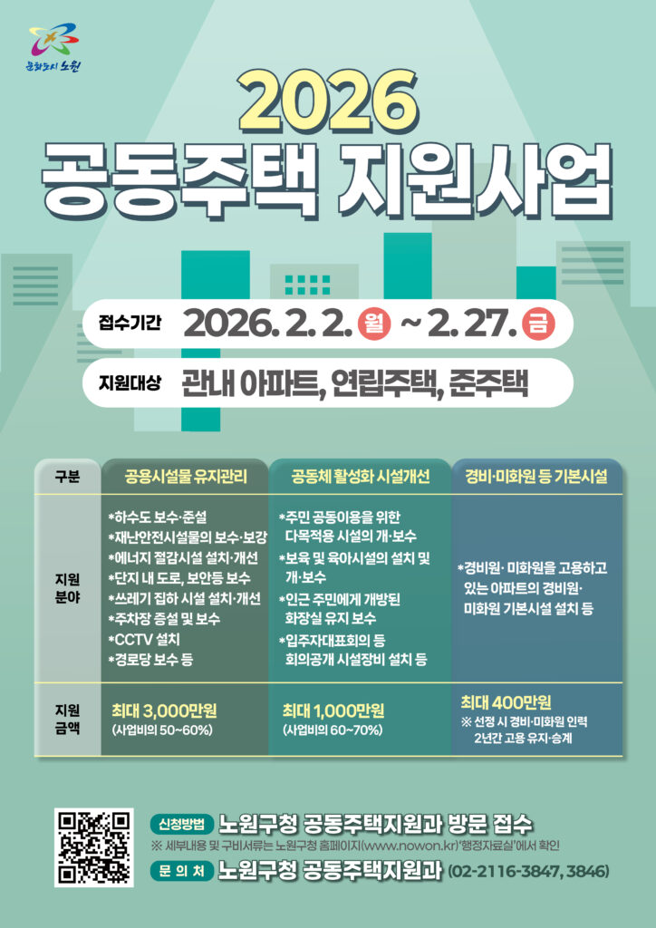 노원구청 관계자는 “전체 주택의 약 80%가 공동주택인 지역 특성을 고려해, 단지 내 유지·관리 부담을 줄이고 주민 간 교류 여건을 개선하기 위해 이번 사업을 마련했다”고 밝혔다.